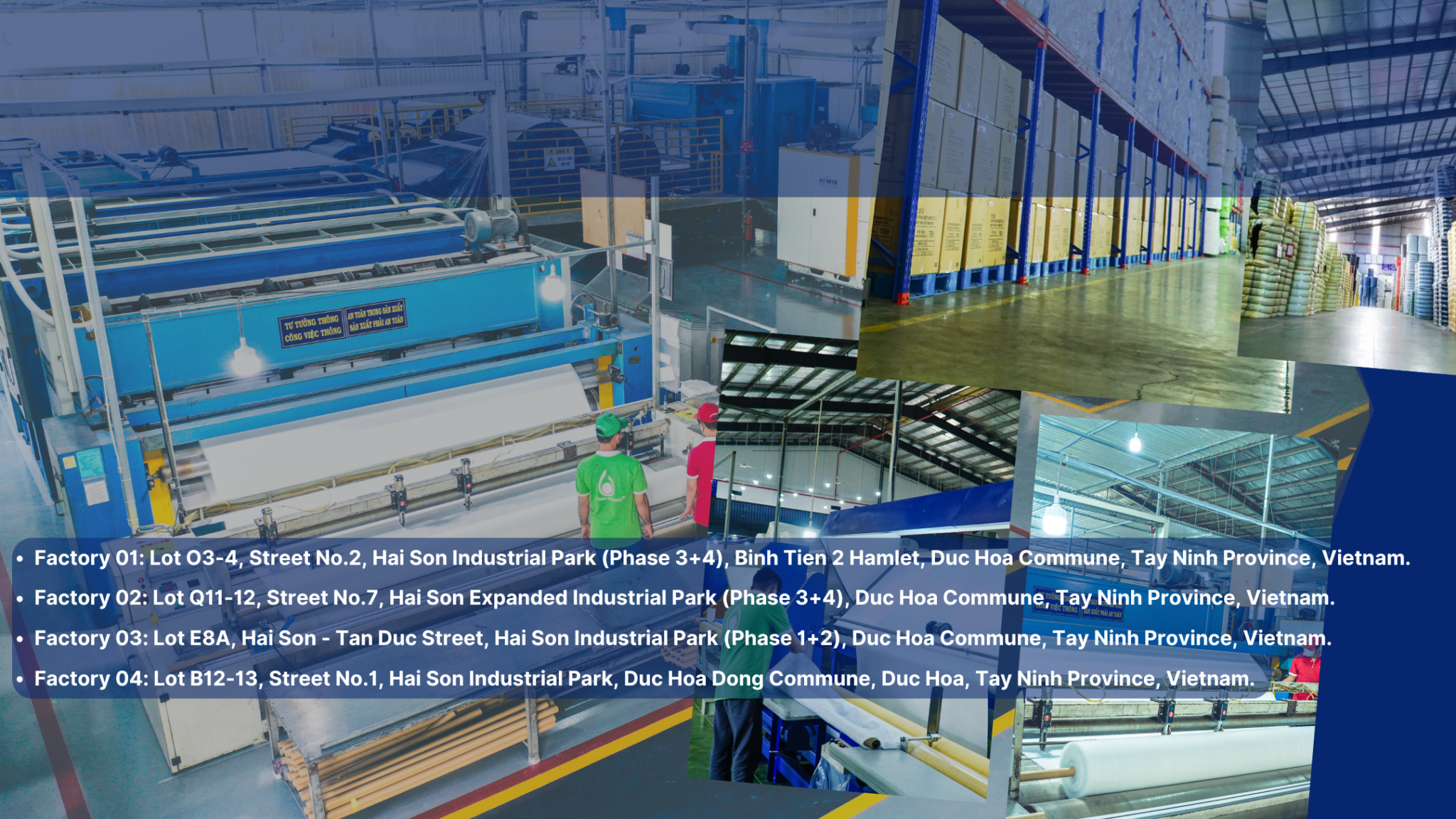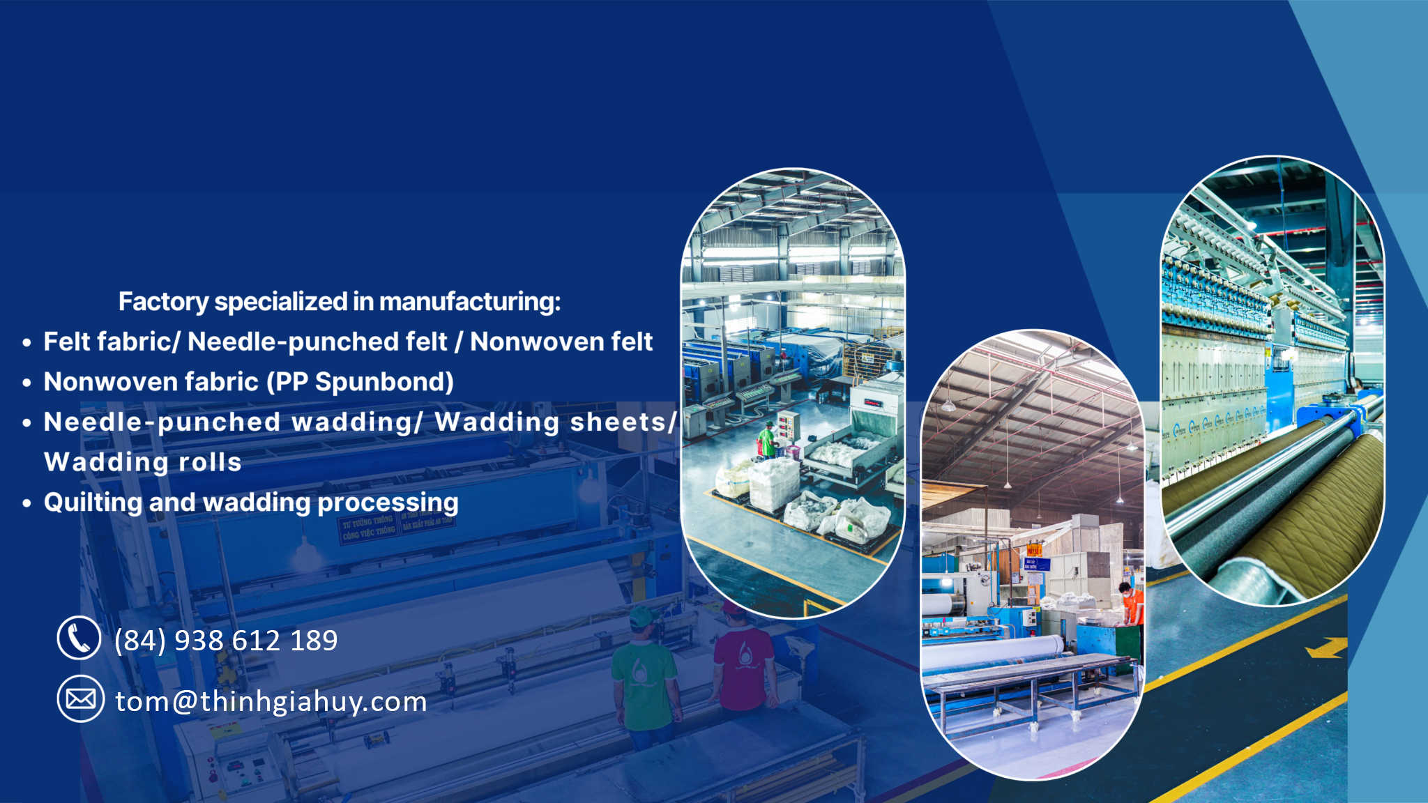 Công ty TNHH Thịnh Gia Huy chuyên cung cấp các sản phẩm như Vải không dệt xăm kim (Nỉ , Felt, Kubu), Gòn (gòn kim, gòn bi, gòn đánh tơi), Keo (keo hột, keo vải, keo tan), Chần gòn và Vải không dệt thân thiện với môi trường.